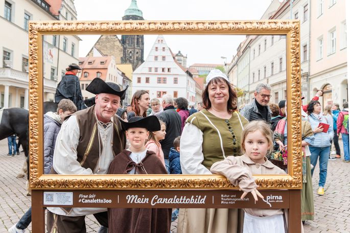 Für einige Minuten verharrt das illustre Ensemble des Vereins „Der Retter der Stadt Pirna – Theophilus Jacobäer e.V.“ exakt an Ort und Stelle für die Kameras der Schaulustigen. Im Anschluss daran wird der temporär gesperrte Bereich wieder öffentlich zugänglich. Das interessierte Publikum darf dann Teil des ikonischen Bildes werden, über den Markt schlendern und selbst posieren. Alle Gäste sind aufgerufen, ihr ganz persönliches Canaletto-Bild oder -Video festzuhalten und per Smartphone-App der Foto-Community venovani mit anderen zu teilen: QR-Code am Gemälderahmen vor dem Canaletto-Café scannen, App laden und mitmachen!