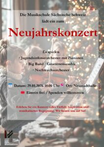 Neujahrskonzert Neustadthalle (Bildquellen: Musikschule Sächsische Schweiz e. V.) Nähere Informationen erhalten Sie >> HIER << + Zu Google Kalender hinzufügen + iCal / Outlook exportieren 00 Tage 00 Stunden 00 Minuten 00 Sekunden Schlagwörter:Familien, Freizeit, Freizeitangebote, Freizeitgestaltung, Jugendliche, Konzert, Kultur, Musikschule Sächsische Schweiz e. V., Neujahrskonzert, Pirna, Pirna Meine Region, Region Pirna und Sächsische Schweiz, Senioren Datum 29 Jan. 2026 Uhrzeit 6:00 pm Standort Neustadt in Sachsen Kategorie Konzert Veranstalter Musikschule Sächsische Schweiz e. V. Nächste Veranstaltung Ladieswalk in Kreischa eine Initiative vom „Pilgrims Inn“ … Datum Feb. 07 2026 Uhrzeit 2:00 pm Teile diese Veranstaltung