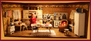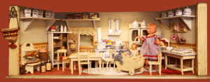 Anett Andrich studierte Abbildungen in alten Verkaufskatalogen und Veröffentlichungen von Museen, kaufte entsprechende Tapeten, arbeitete mit Leim und Farbe und verhalf so einigen ihrer Puppenküchen wieder zu neuem Glanz. Zu jedem Objekt weiß sie Geschichten zu erzählen. Anett Andrich kennt die Herkunft und macht voller Stolz und Freude auf die vielen liebevollen Details aufmerksam. Es fehlt einfach nichts, was damals in den großen Küchen zur Ausstattung gehörte.